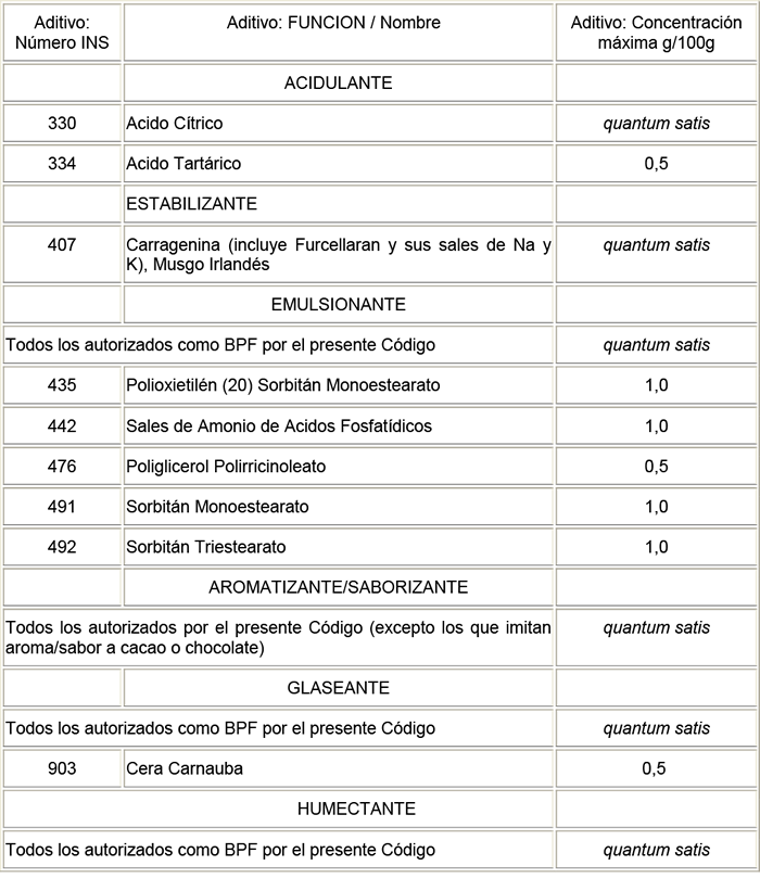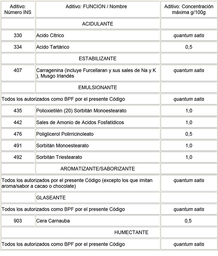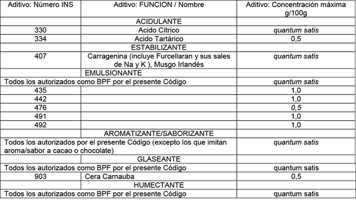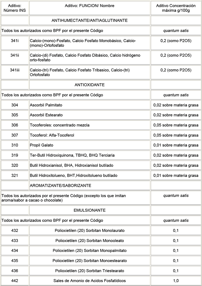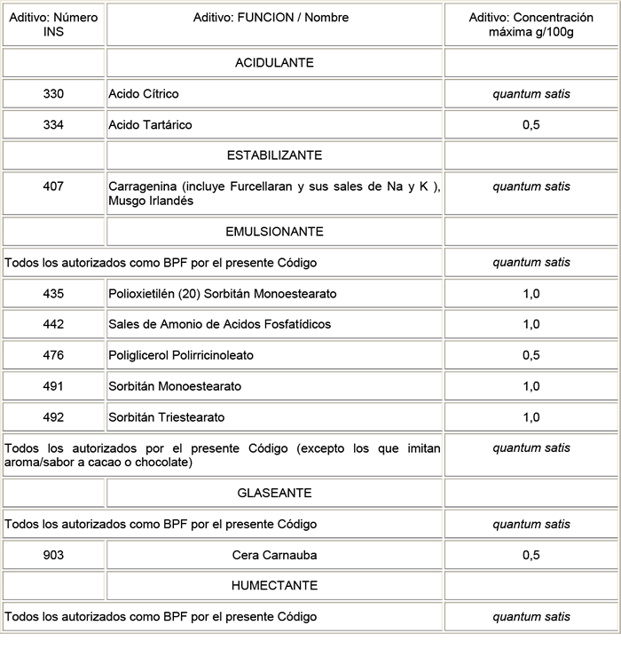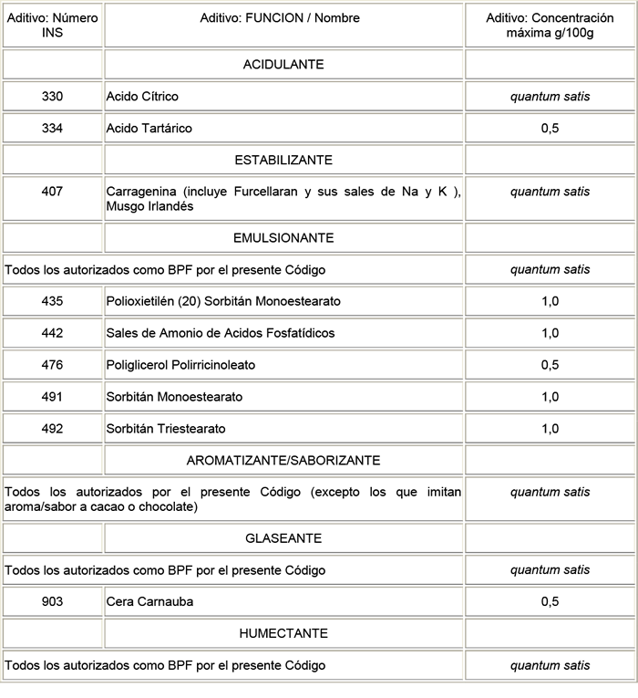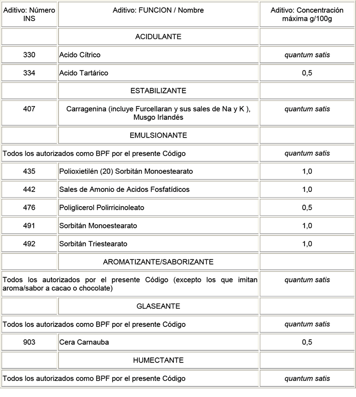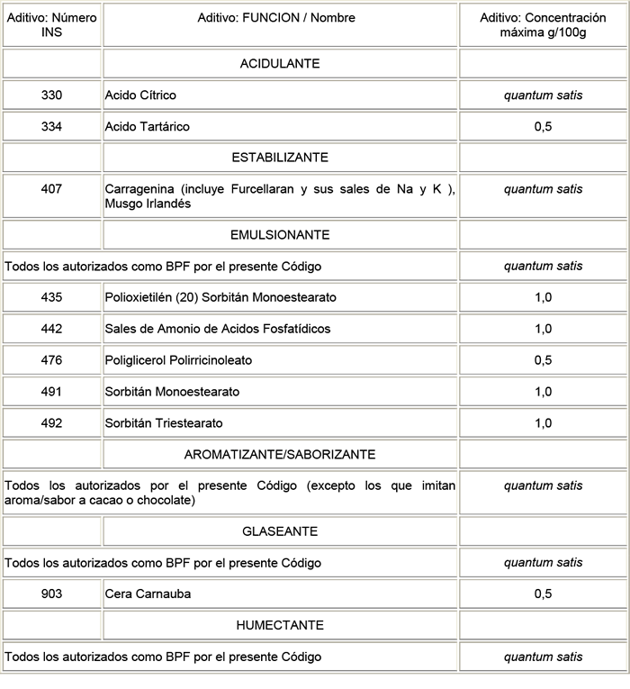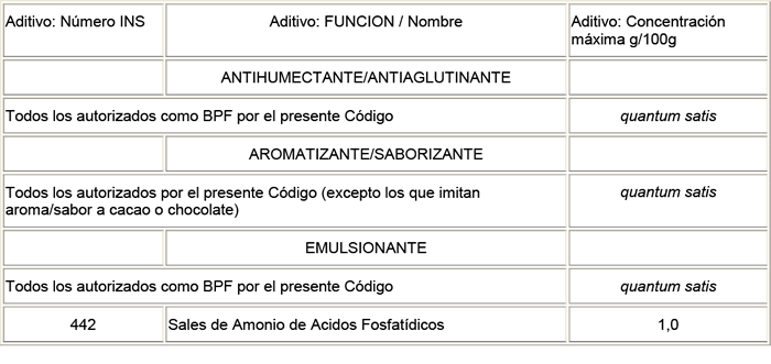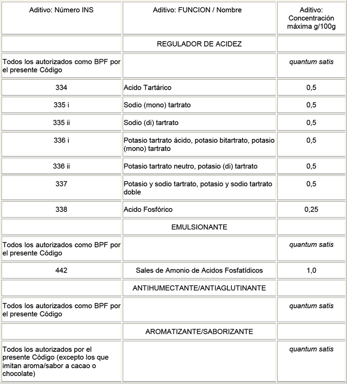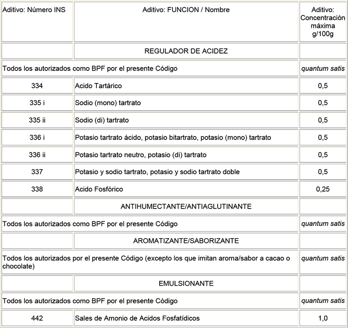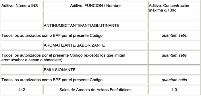 Para los alimentos con cacao en polvo para la preparación de bebidas se admiten los aditivos que se detallan a continuación