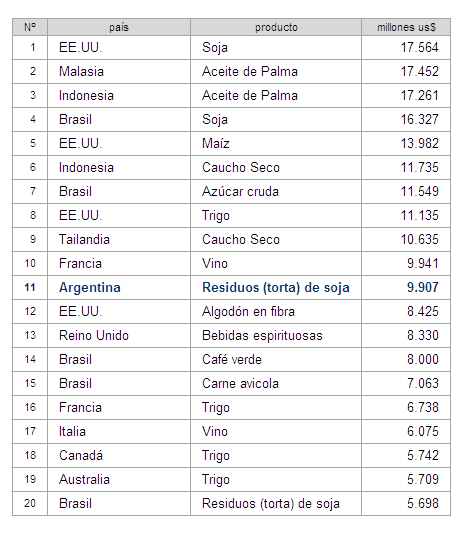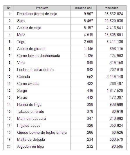 En este cuadro se muestran los primeros 20 productos vendidos por la Argentina al mundo según los datos de FAO. Los mismos se encuentran ordenados de mayor a menor por el total de valor exportado (millones de dólares).