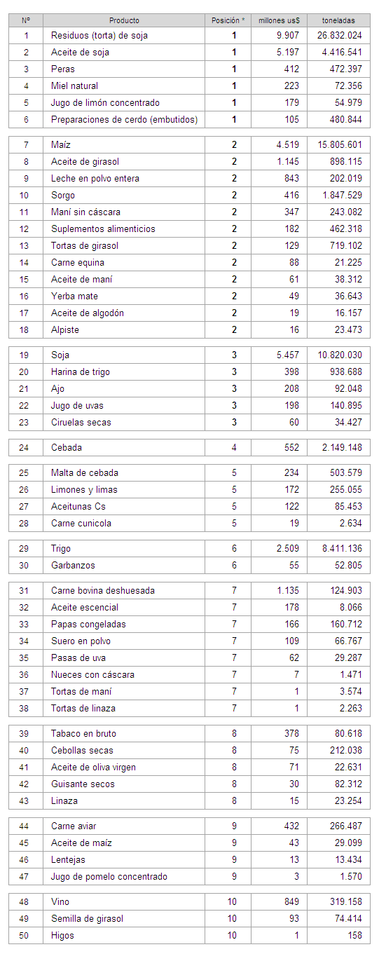 En estos cuadros se presentan los productos y la importancia de los mismos al ser comparados con las ventas del resto de los países. De esta forma se puede ver como la Argentina es el principal exportador de seis productos, el segundo en doce productos, y de esta forma continua la tabla mostrando los 50 productos agroalimentarios más vendidos en el mercado mundial.